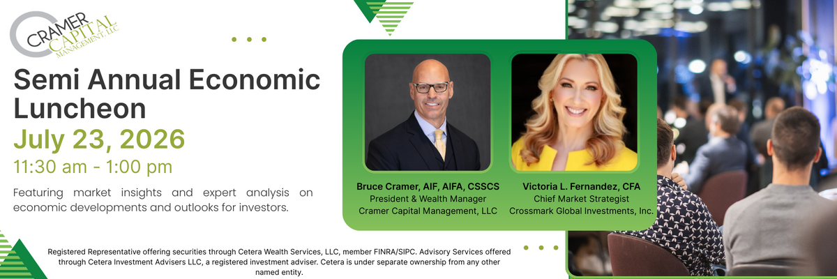 Join us for the Cramer Capital Management Semi Annual Economic Luncheon, taking place on July 23, 2026 from 11:30 AM to 1:00 PM Central Time at the Diamond Conference Center in Kansas City, Missouri. This exclusive event will feature Bruce Cramer, President & Wealth Manager of Cramer Capital Management, LLC, who will share valuable insights and perspectives on current financial trends.